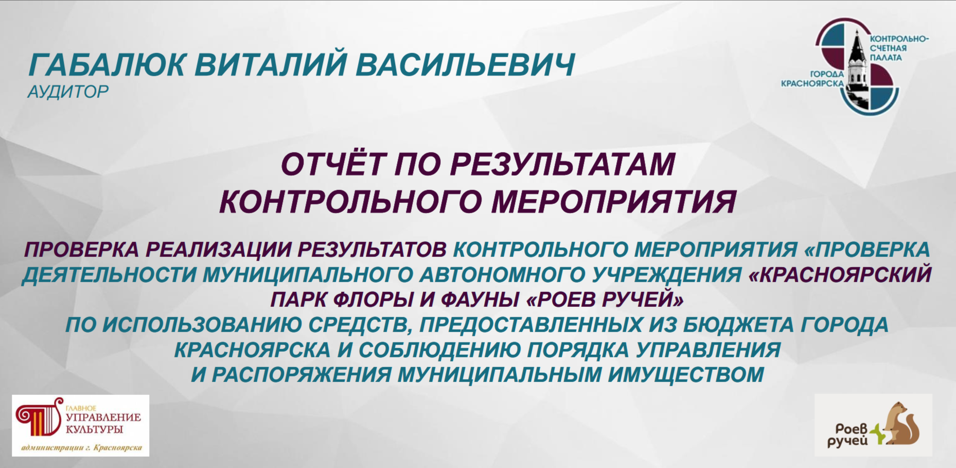 В ходе заседания рассмотрен отчет по результатам контрольного мероприятия «Проверка результатов контрольного мероприятия «Проверка деятельности МАУ «Красноярский парк флоры и фауны «Роев ручей» по использованию средств, предоставленных из бюджета города Красноярска и соблюдению порядка управления и распоряжения муниципальным имуществом».