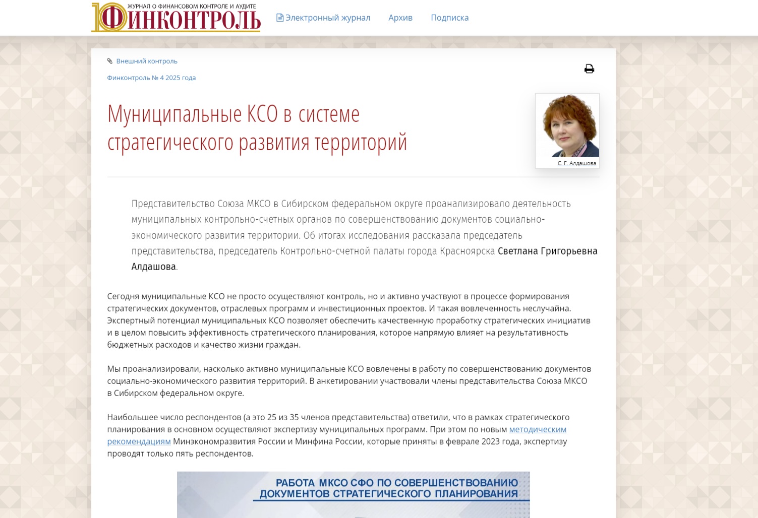 В журнале "ФИНКОНТРОЛЬ" (№ 4 за 2025) публикована статья председателя Контрольно-счетной палаты города Красноярска Алдашовой Светланы Григорьевны "Муниципальные КСО в системе стратегического развития территорий".
